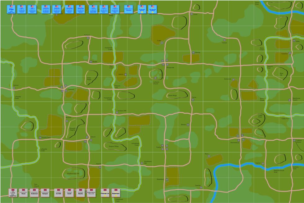 The game got off to quick start because I had already issued orders to Heintzelman’s Corps to advance and engage Jackson’s forces near the Barnes Farm. This area was the “contact” terrain square in the campaign game and, as were aware of each others presence, we were able to start play with orders already issued to our troops.